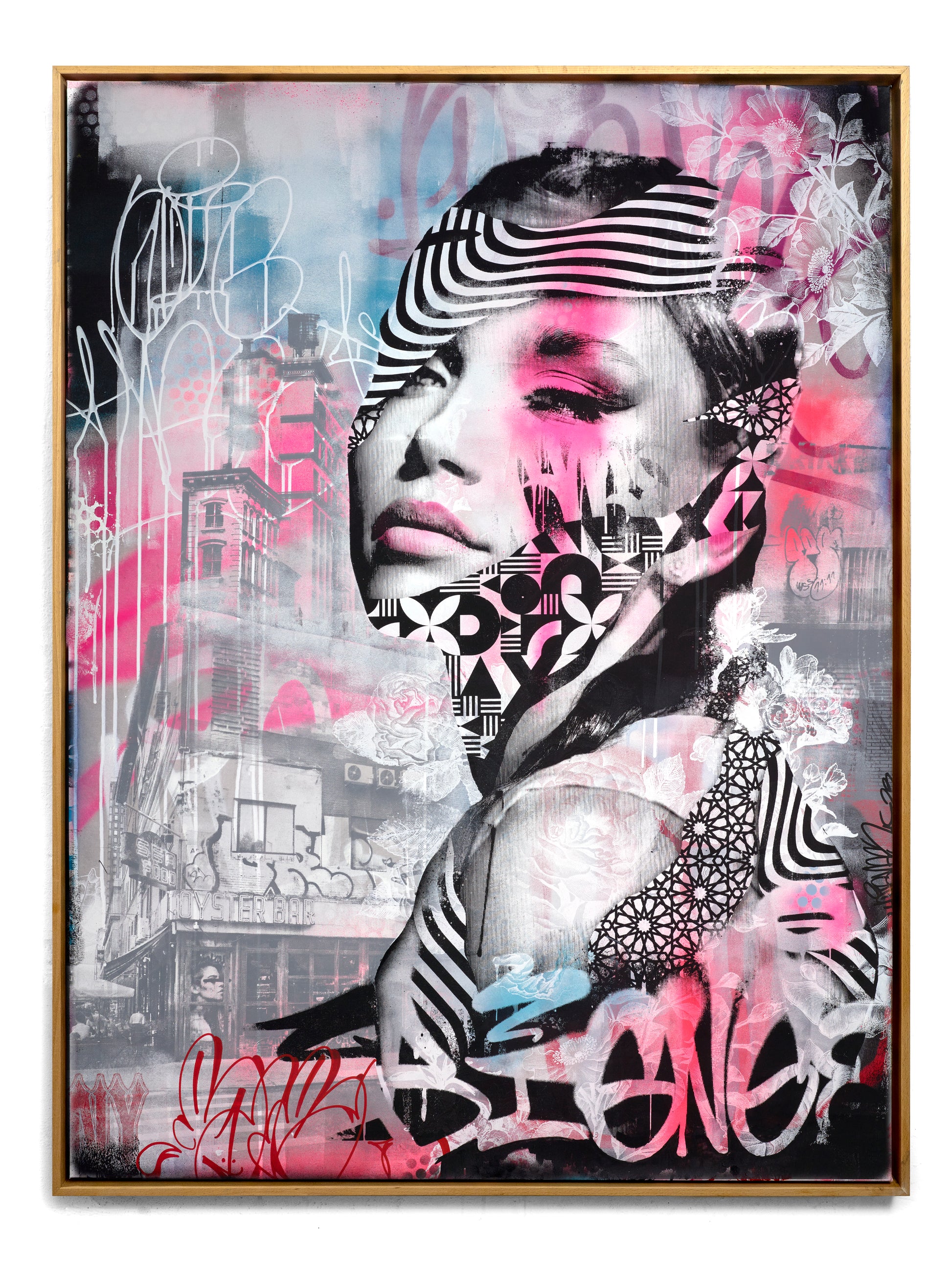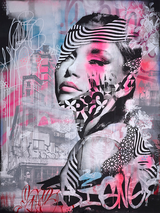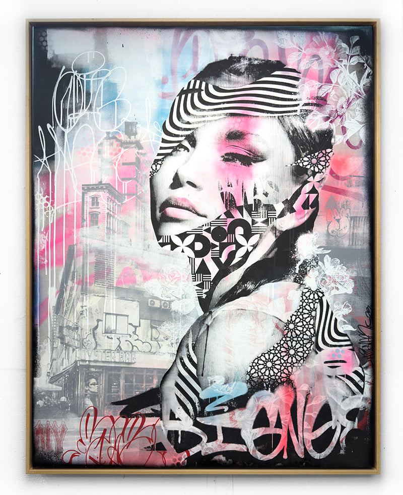 It juxtaposes the beauty found in cityscapes, nature and people. A series of figurative paintings where women’s elegance shines through layers of flowers and patterns fuelled by graffiti and the energetic aesthetics of cities like New York or London.