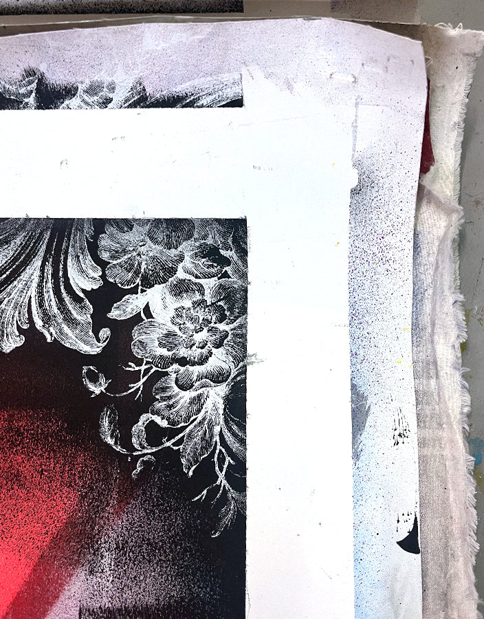 His work is built through layering, combining aerosol paint, acrylics, silkscreen, inks, collage, and photography to create depth and texture. Compositions often exceed 30 layers, exploring the interplay between urban landscapes and organic elements, juxtaposing architectural structures like bricks, cables, and water towers with botanical imagery.