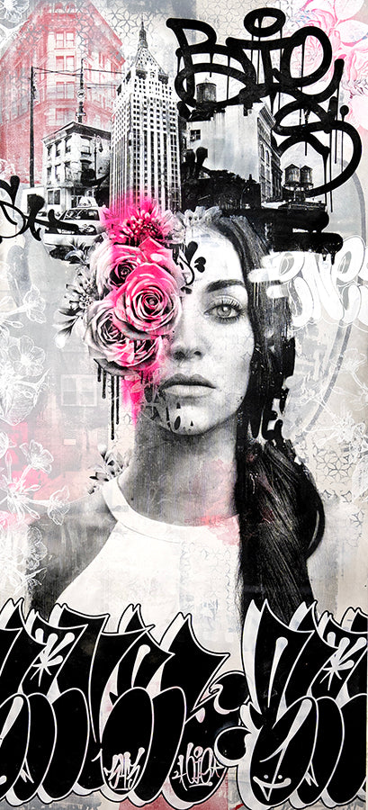 “Pretty and Gritty” is the latest series by BNS, blending the beauty of cityscapes, nature, and people through figurative paintings. Women’s elegance emerges from layers of floral patterns, fueled by graffiti and the vibrant energy of cities like New York and London.
