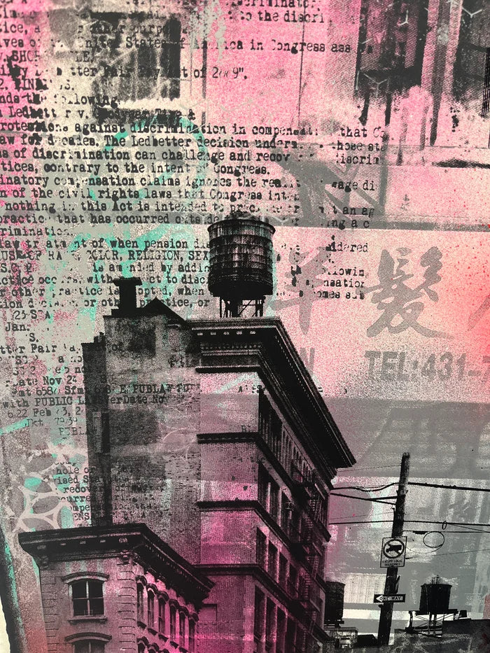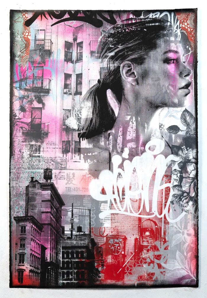 His work is built through layering, combining aerosol paint, acrylics, silkscreen, inks, collage, and photography to create depth and texture. Compositions often exceed 30 layers, exploring the interplay between urban landscapes and organic elements, juxtaposing architectural structures like bricks, cables, and water towers with botanical imagery.