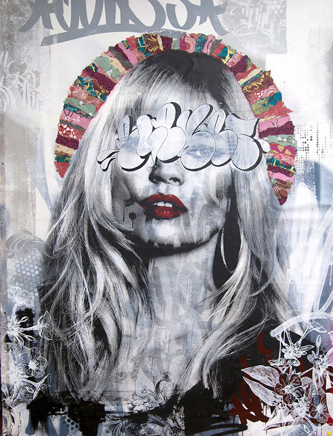 Photography sessions with models in his studio inspire symbols that reflect each subject’s story. Some paintings feature graffiti-covered eyes, adding anonymity, while others collage different faces and body parts to create entirely new personas.