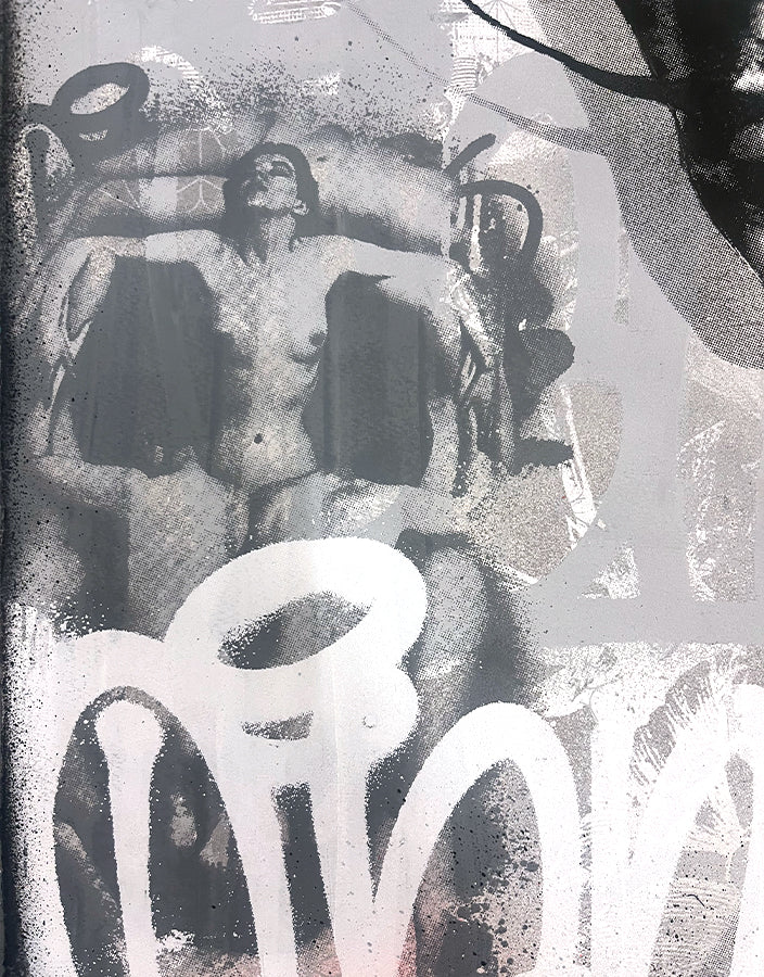 His work is built through layering, combining aerosol paint, acrylics, silkscreen, inks, collage, and photography to create depth and texture. Compositions often exceed 30 layers, exploring the interplay between urban landscapes and organic elements, juxtaposing architectural structures like bricks, cables, and water towers with botanical imagery.