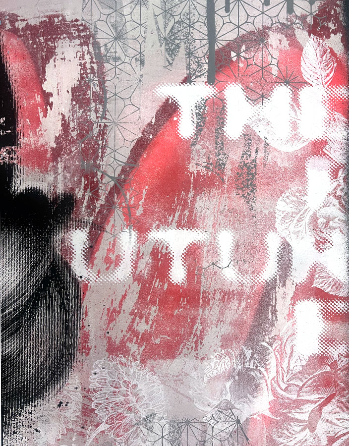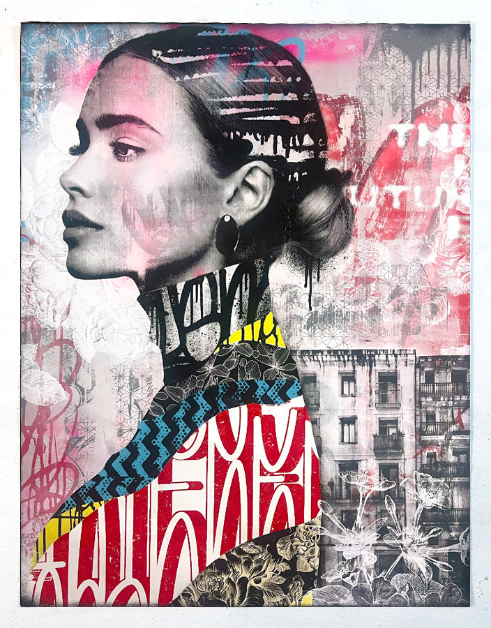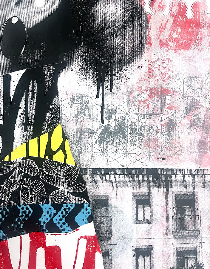 His work is built through layering, combining aerosol paint, acrylics, silkscreen, inks, collage, and photography to create depth and texture. Compositions often exceed 30 layers, exploring the interplay between urban landscapes and organic elements, juxtaposing architectural structures like bricks, cables, and water towers with botanical imagery.